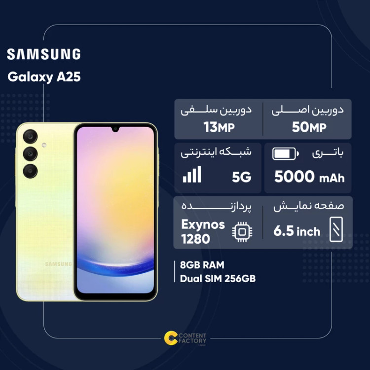 بدون هیچ تعریف اضافی باید بگوییم که تنوع بالای گوشیهای هوشمند میانرده شرکت سامسونگ، پاسخگوی سلایق مختلف با توقعات مختلف است که سامسونگ Galaxy A25 یکی از این میانردهها است که به نسبت قیمت در نظر گرفته شده، از مشخصات فنی بسیار مناسب و کاملا قابل قبولی بهره برده است. طراحی در نظر گرفته شده برای Galaxy A25، طراحی آشنایی است که پیش از این هم چنین طراحی را در گوشیهای هوشمند سامسونگ شاهد بودیم. در نمای روبهرویی این گوشی به صفحهنمایش 6.5 اینچ با رزولوشن 1080×2340 پیکسل از نوع سوپرامولد مجهز شده است. صفحهنمایش با توانایی نمایش 396 پیکسل در هر اینچ، نرخ بروزرسانی 120 هرتز و حداکثر روشنایی 1000 نیت (nits). با توجه به مشخصات در نظر گرفته شده، با یکی از بهترین صفحاتنمایش در بین گوشیهای میانرده روبهرو هستید. در قسمت پشتی هم یک سنسور دوربین اصلی با رزولوشن 50 مگاپیکسل در کنار سنسور 8 مگاپیکسل فوقعریض و سنسور 2 مگاپیکسل ماکرو در نظر گرفته شده. دوربین اصلی این گوشی بهخوبی توقعات شما را در حد و اندازه یک گوشی میانرده برای عکاسی نور روز و نور شب برآورده میکند. فیلمبرداری 4K هم از دیگر مشخصات این گوشی است. دوربین سلفی 13 مگاپیکسل این گوشی هم عملکرد کاملا قابل قبولی دارد. در بخش مشخصات سختافزاری هم این گوشی به پردازنده اگزینوس 1280 مجهز شده است. پردازندهای که سبب شده تا این گوشی در اجرای بازیهای محبوب و نرمافزارهای کاربردی، عملکرد روان و بسیار خوبی داشته باشد. باتری با میزان ظرفیت 5000 میلیآمپرساعت هم به ازای هر بار شارژ صد درصدی، زمان آماده بهکار دو روز را در حالت استفاده معمولی در اختیارتان قرار میدهد. در مجموع باید بگوییم که اگر به دنبال خرید گوشی میانردهای هستید که به صفحهنمایش بسیار باکیفیت، دوربین اصلی قدرتمند، پردازنده و باتری مناسب مجهز شده باشد، سامسونگ Galaxy A25 میتواند گزینه بسیار مناسبی برای شما باشد.