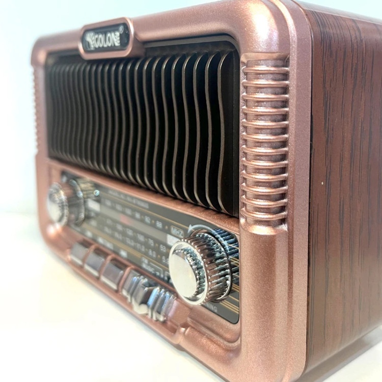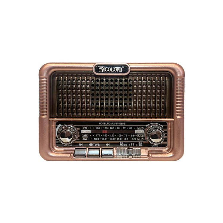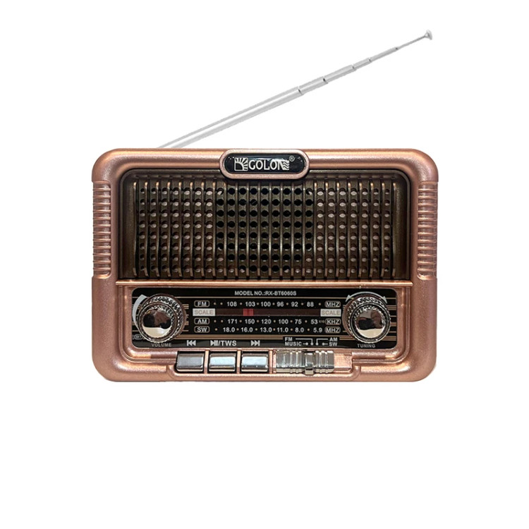 کمپانی GOLON یکی از معروفترین شرکتهای تولیدکننده رادیو و اسپیکر در دنیا است. رادیو گولون مدل RX-BT6061S یکی از محصولات جدید این شرکت است. این رادیو قابلیت دریافت امواج رادیویی FM در بازه 88 الی 108 مگاهرتز، موج AM در بازه فرکانسی 530 تا 1710 کیلوهرتز، موج SW در بازه فرکانسی 5٫9 الی 18 مگاهرتز را دارد. همچنین این دستگاه قابلیت پخش موسیقی از طریق حافظه USB، کارت حافظه microSD و بلوتوث طراحیشده است و کیفیت صدای بالایی دارد. تامین انرژی رادیو اسپیکر Golon RX-BT6060S از طریق باتری لیتیومی مدل 18650 قابل شارژ با ظرفیت 2200 میلی آمپر و همچنین پنل خورشیدی در قسمت بالای دستگاه صورت می گیرد طراحی کلاسیک بدنه با استفاده از پلاستیک مرغوب با طرح چوب صورت گرفته است؛ برخورداری از آنتن جمع شونده با قابلیت تنظیم میزان ارتفاع تا 30 سانتی متر از دیگر ویژگی های این محصول است. کلیدهای کنترلی به منظور مدیریت موزیک در حال پخش، تنظیم امواج رادیویی، تنظیم صدا بر روی پنل جلویی دستگاه تعبیه شده اند. در سمت چپ دستگاه علاوه بر کلید تنظیم حالت پخش، درگاه کارت حافظه USB، درگاه حافظه microSD و چراغ شارژ تعبیه شده است. همراه محصول سیم شارژ microUSB، بند و باتری لیتیومی 18650 ارسال می شو